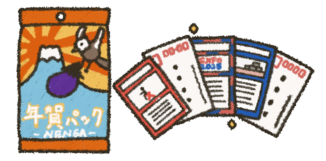 年賀状をカードパックのようにし、ノーマル年賀状4枚とSSR年賀状を入れます。受け取った人が集えばギリギリ戦えます。